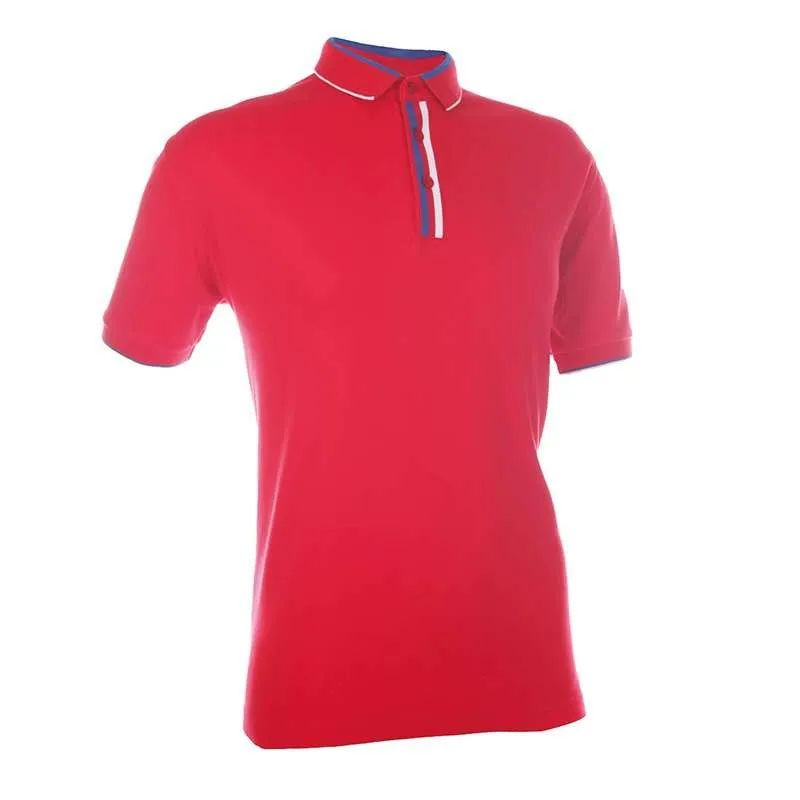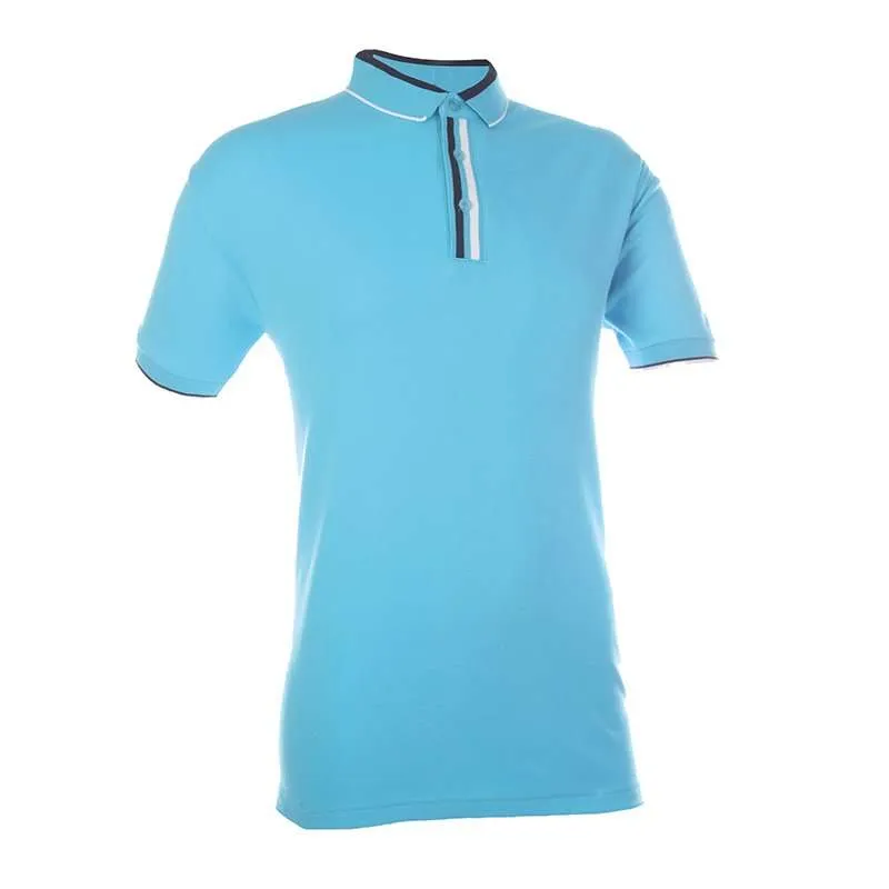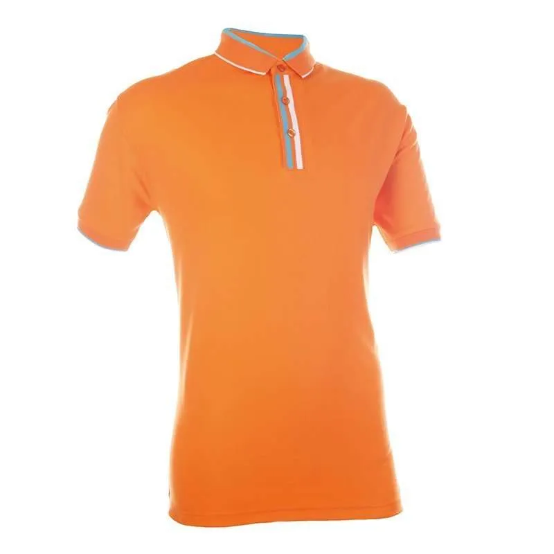 This cotton interlock tee features a design to collar, sleeves and buttons.